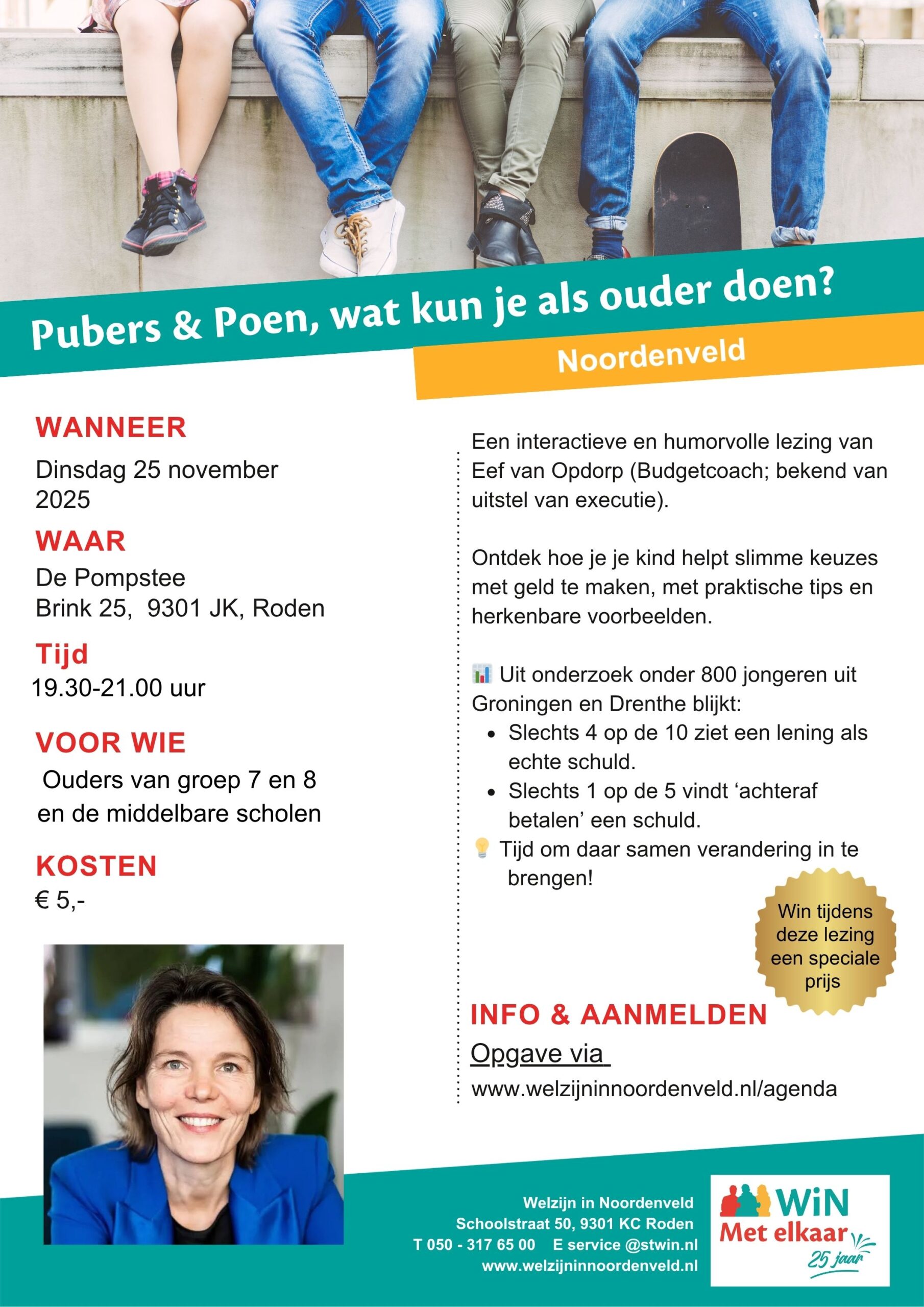 Kom op 25 november naar de interactieve en humorvolle lezing van Eef van Opdorp (bekend van Uitstel van Executie). Eef laat op een inspirerende en herkenbare manier zien hoe je als ouder je kind kunt helpen slimme keuzes met geld te maken –  mét praktische tips die je thuis direct kunt gebruiken.